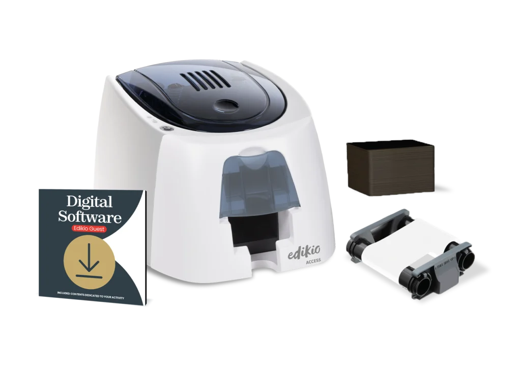 Edikio Access Guest è la soluzione all-in-one più conveniente per creare e stampare le tue etichette prezzo su carte PVC. Ideale per piccole quantità di etichette con stampa fronte singolo. La soluzione Edikio Access Guest include tutto il necessario per iniziare a stampare subito: